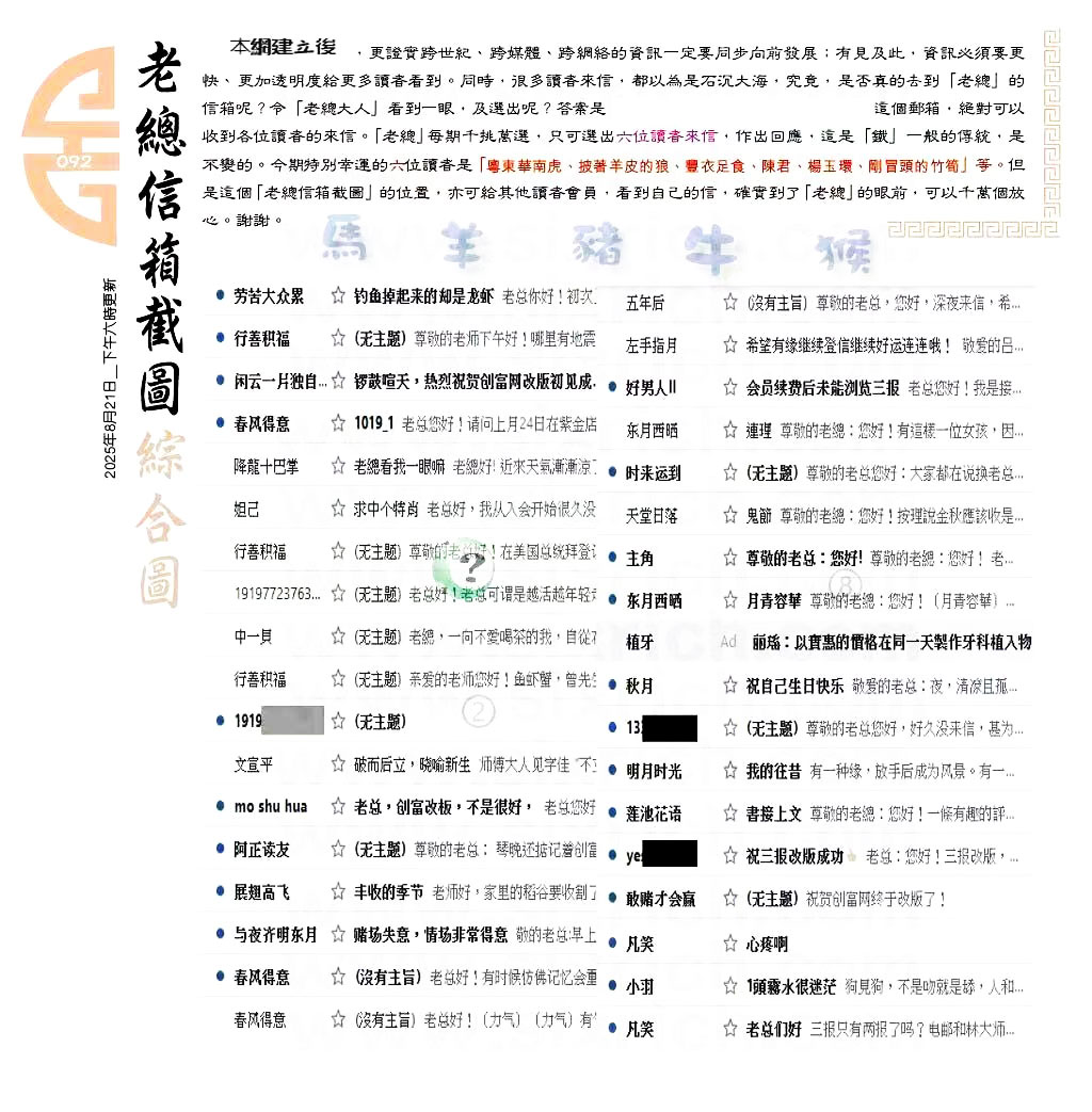 | 主题 :092期:六合皇金句/老总论码/萧公子/林大师/五行夺码/老总信箱截 |