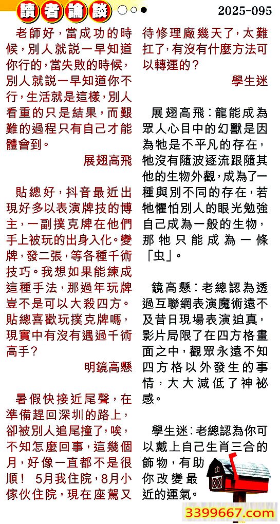 | 主题 :095期:彩民推荐〖貼信讀者論壇〗 |