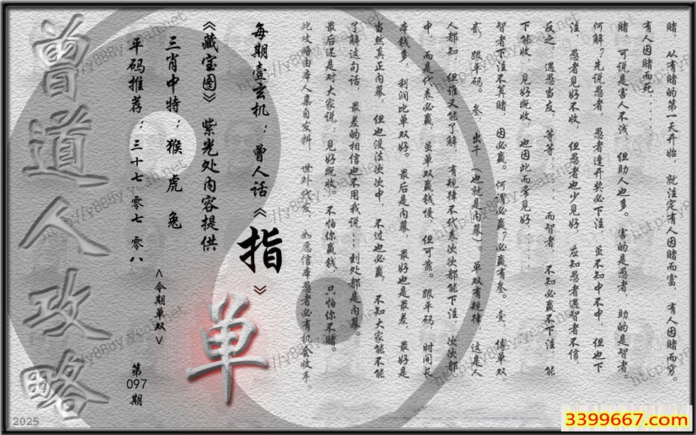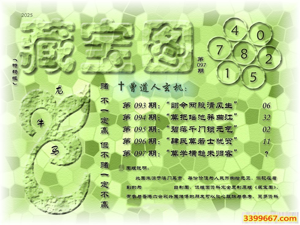 | 主题 :097期藏寶圖 新:莫学横趋未归客 老:诗老不知梅格在 禁:鼠 禁:3尾 |