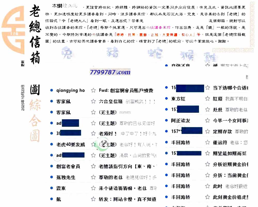 | 主题 :114期:六合皇金句/老总论码/萧公子/林大师/五行夺码/老总信箱截 |