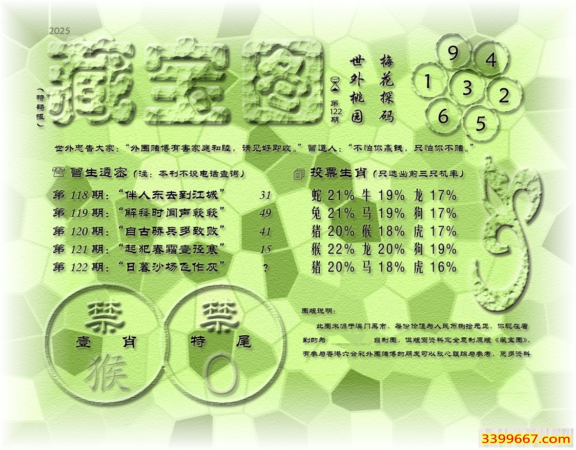 122期藏寶圖 新:割鲜籍草酒淋漓 老:日暮沙场飞作灰 禁:猴 禁:0尾 玄機字:《将》